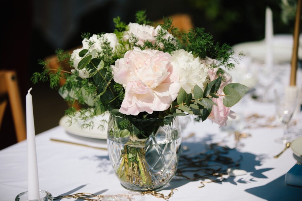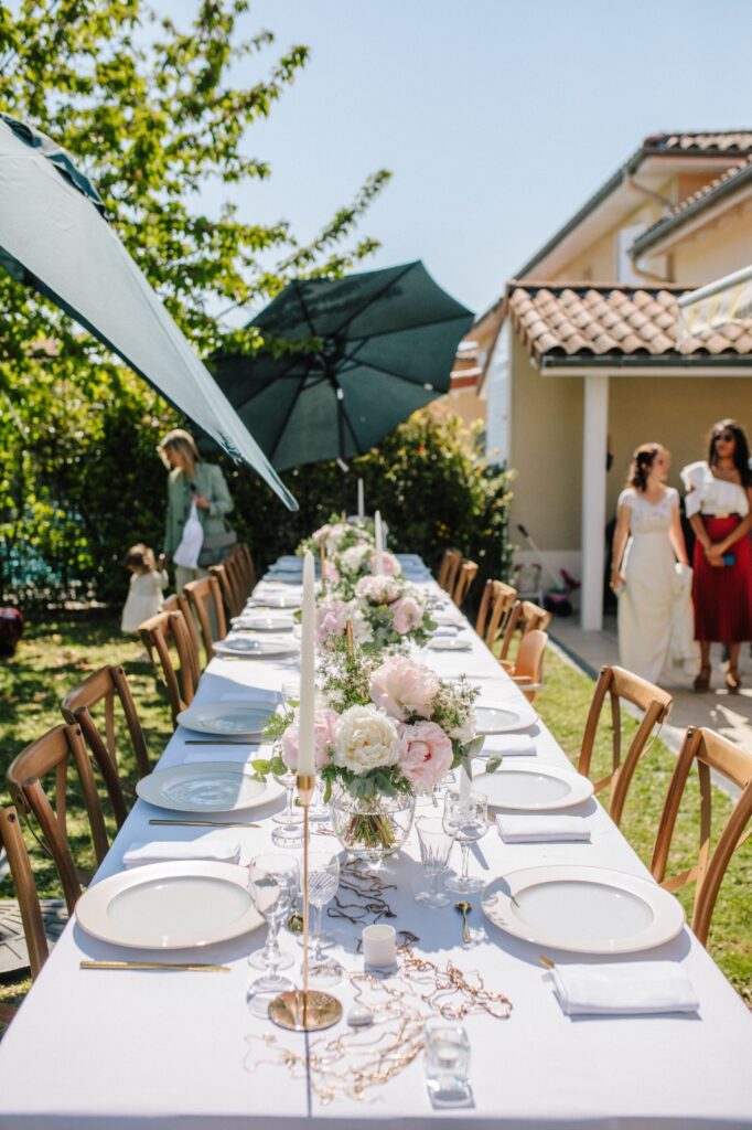 Le mariage intimiste à Chamonix a commencé à prendre forme en milieu de matinée. Tandis que la mariée se faisait maquiller, l’équipe D Day Wedding Planner Chamonix est arrivée sur place. Avec le marié, elle a installé les tables et apporté la touche finale à la décoration du jardin.