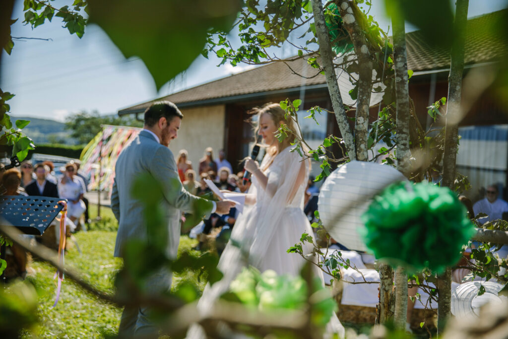 Un bel hommage clôture la cérémonie : une jolie surprise attend la mariée. Des arcs bandés forment une allée majestueuse pour leur sortie de ce mariage rural dans les Alpes.