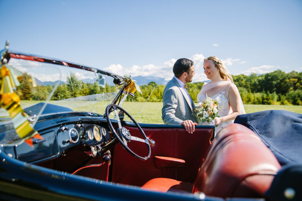 Après quelques minutes de stress, celle-ci arrive enfin dans une magnifique voiture vintage. Enfin, le cortège peut être lancé et la cérémonie débute, officiée par D Day Wedding Planner Annecy.