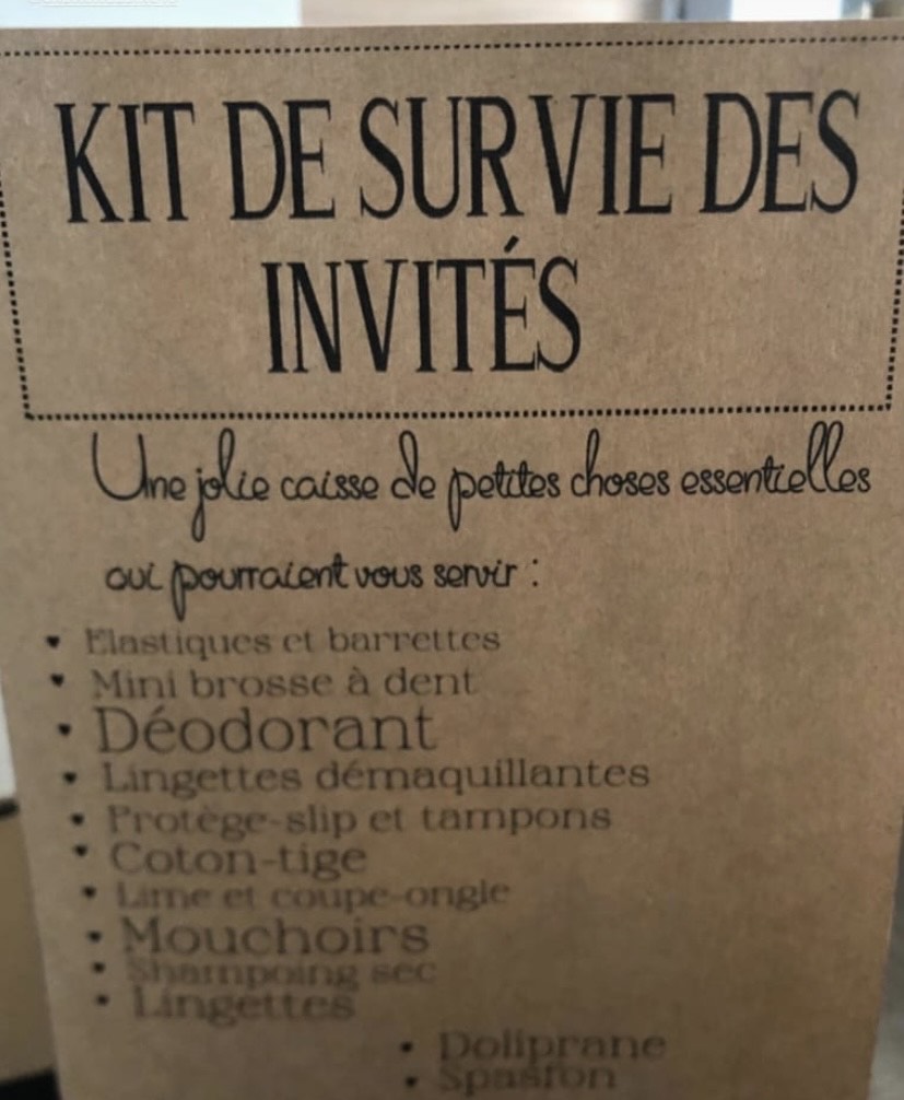 Très utile petites blessures, le kit pharmacie est toujours le bienvenu même si on espère à ne pas l’avoir à utiliser. Composé de pansements, de désinfectants ou encore de médicaments tels que des dolipranes, il peut s’avérer être un vrai soulagement pour mariés et invités en cas de bobos.