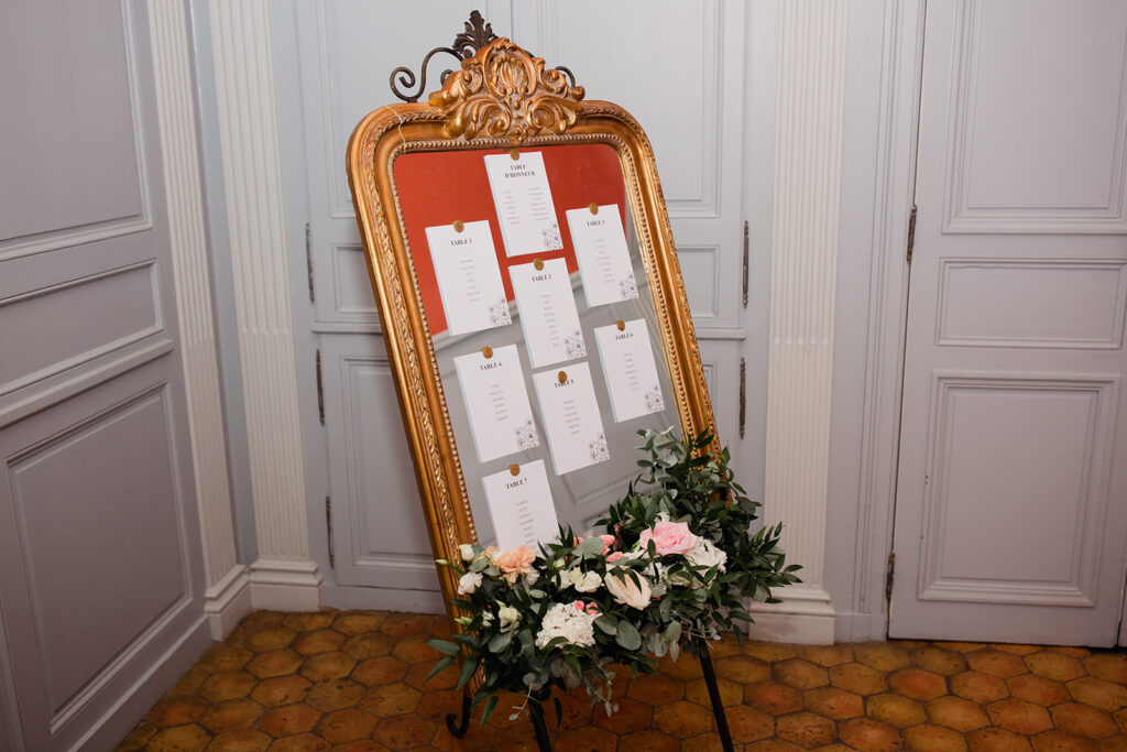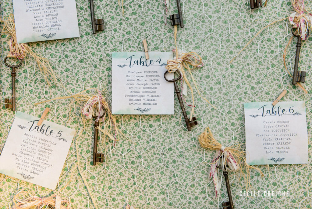 Par exemple, vous pourrez suspendre les cartes des plans de tables sur des fils suspendus, ou bien encore les accrocher sur un support ou les disposer dans un joli cadre original. Tout ceci dans une papeterie assortie au thème du mariage.