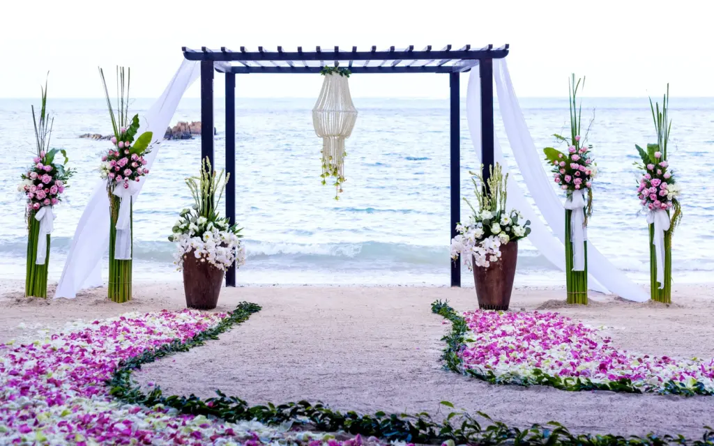 Le thème tropical s’adapte idéalement avec la décoration florale. Vous pouvez opter pour des fleurs tropicales comme l’oiseau de paradis, l’anthurium, la passiflore, l’hibiscus, le frangipanier. Vous pouvez les disposer sur l’arche, centre de table ou en guise de bouquet de fleurs.