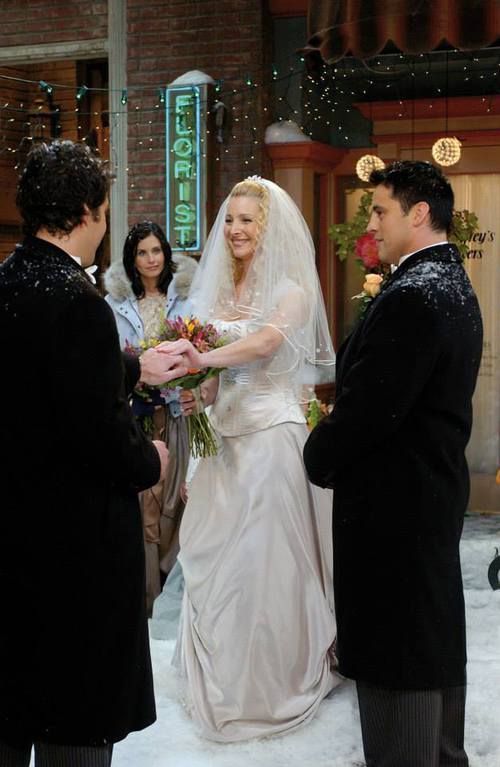 Pour rester en accord avec son personnage haut en couleur, Phoebe n’a pas choisi un mariage traditionnel. En effet, elle opte, dans la dernière saison, pour un mariage hivernal! Après une suite de catastrophe liées à une tempête de neige, les deux tourteraux vont finalement se marier devant l’iconique Central Perk, lieu mythique et repers des Friends.