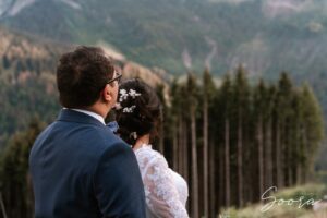 Pour le marié, il lui fallait une couleur qui irait avec cette saison et cet environnement. Samuel a opté pour un costume 3 pièces d’un joli vert anglais sur les conseils de leur organisatrice de mariage Dijon.