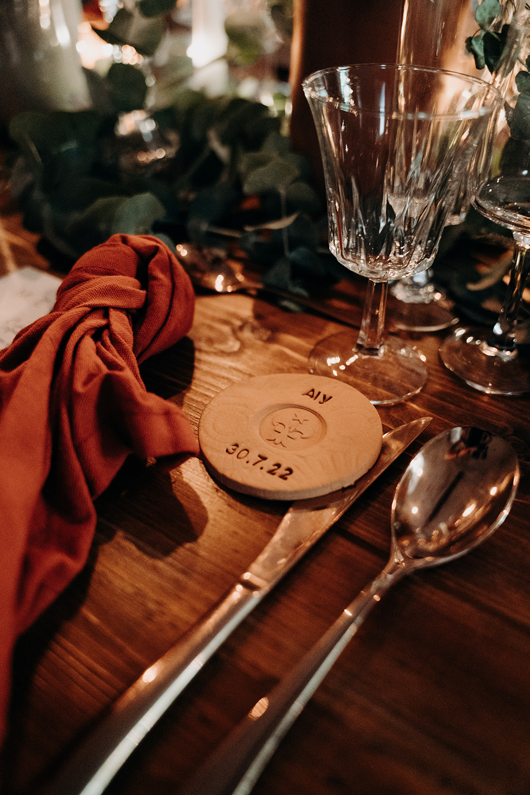 De plus, nous retrouvons le thème terracotta au niveau des marques places. Nos chers mariés les ont fais eux même. Une jolie décoration en terre cuite avec le sceau des mariés.