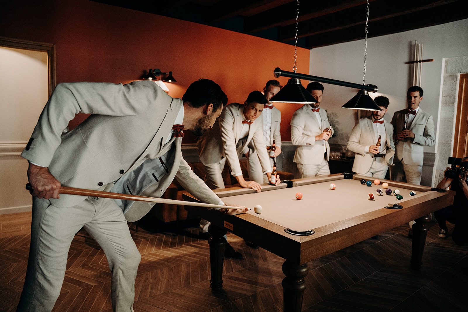 En premier lieu, imaginer vous et votre bande de potes vous préparer pour votre mariage dans un pièce décoré dans l’esprit d’un fumoir d’époque. Ainsi donc, beaucoup de bois, une bibliothèque, un service à Whisky et un billard. En d’autres termes, c’est bien là que B s’est préparé pour dire oui à sa belle. Aussi, les garçons n’ont pas manqué l’occasion de trinquer au futur marié et de faire une partie de billard ! Ambiance détente assurée.