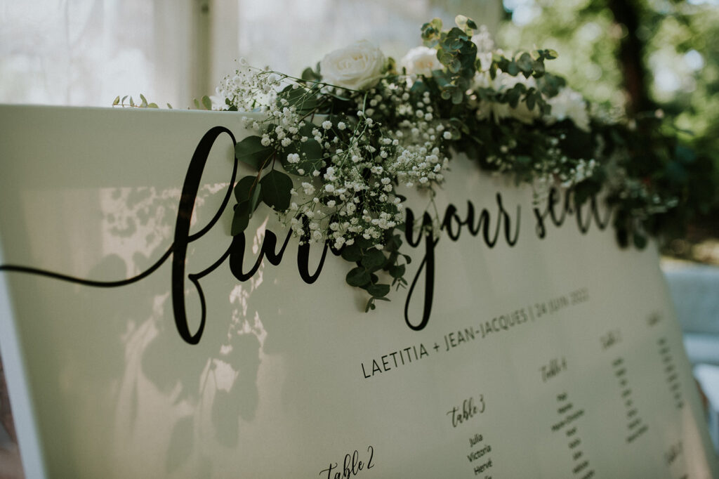 Afin de garde l’envie de simplicité, L&JJ ont pris une plan de table blanc ainsi qu’un panneau de bienvenue blanc avec une écriture noire de chez Save the date Annecy.