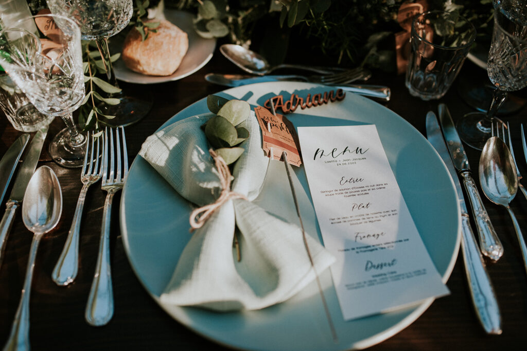 Grâce à leur traiteur C Gastronomie, L&JJ ont pu avoir la vaisselle de chez Option. Ils ont fait le choix de couverts vintages pour mettre une touche élégante sur les tables en bois rustique. Cette touche un peu différente est mise en lien avec les verres vintages aussi et surtout dépareillés: verre à eaux, vin blanc et vin rouge. Pour les finissions, la serviette vert d’eau et les assiettes verts/bleu ajoutent juste la touche originale et élégante que L souhaitaient pour son mariage.