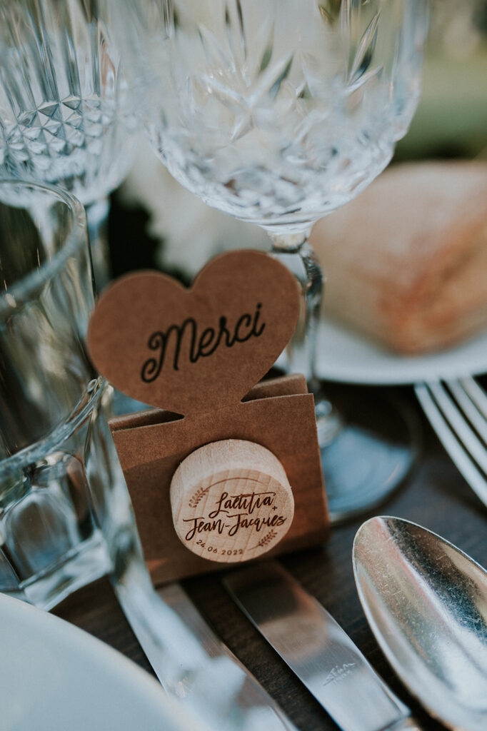 Pour leur Mariage Vert en Haute Savoie, D Day Wedding Planner Annecy leur a conseillé d’avoir quelques choses qui se gardent. Leur choix s’est fait sur les bouchons de bouteille de vin réutilisable. Quelle bonne idée pour garder un souvenir avec les prénoms de mariés ainsi que la date.