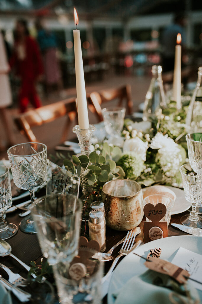Pour mettre en lumière la vaisselle, L&JJ ont miser sur des fleurs simples: pivoine, eucalyptus et une composition la plus conséquente possible. Tout en laissant les chandelle passer part dessus et garder la touche de romantisme qu’elle aimait tant. Les compositions créer par Avec Un P’tit Rien on apporter beaucoup de joie et vitalité à leur tente en cristal. Même si la tente en cristal permet de faire un dedans dehors très agréable, elle apporte une certaine froideur pour l’intérieur de la salle. Apporté de la fleur blanche et verte ajoute une touche vivante et même vibrante à la décoration de cette espace.