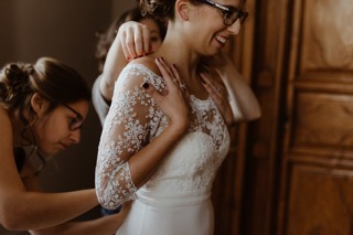 Prenons pour exemple une robe composée d’un body et d’une jupe amovible. Après votre mariage, chaque partie peut être réutilisée séparément. Il y a même la possibilité d’enlever la jupe pour la partie dansante de votre évènement afin de mettre une tenue plus confortable !