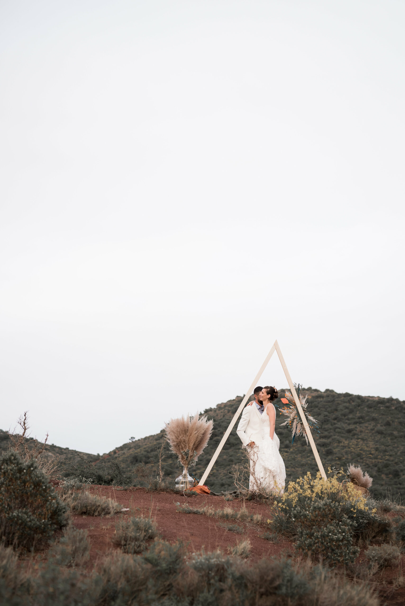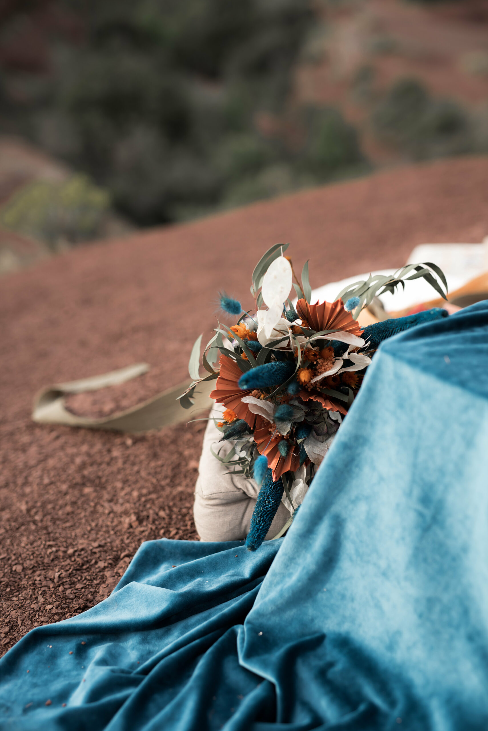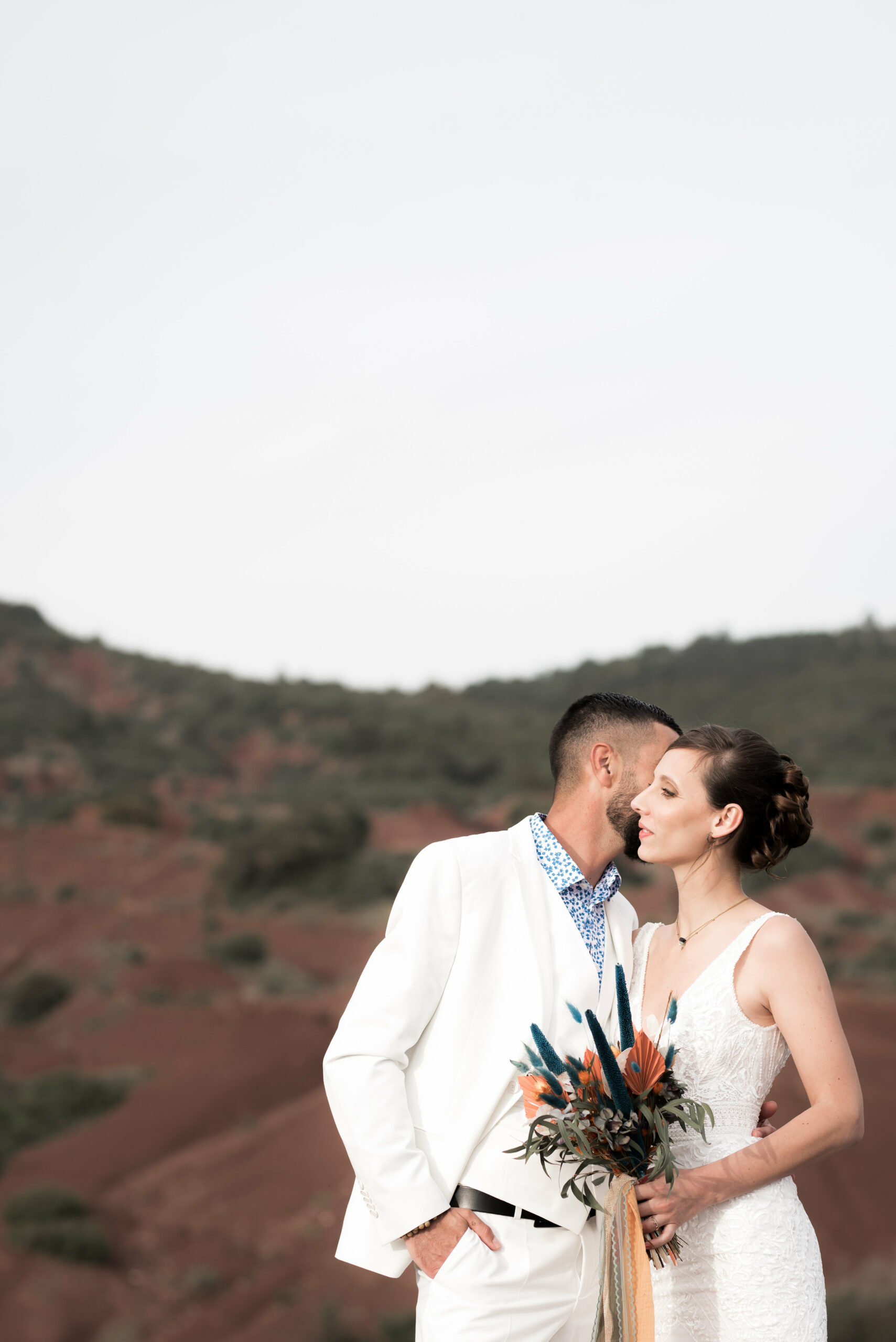 Lorsque nos jeunes mariés nous ont contacter, ils souhaitaient un mariage unique en petit comité au beau milieu de cette nature qu’ils aiment tant. Nous avons commencé à parler décoration. A ce moment là, D Day wedding planner Languedoc à une idée : pourquoi ne pas jouer avec les couleurs complémentaires. Les mariés ont adoré, et de la est parti l’idée d’organiser un jolie elopement dans les tons bleu canard et ocre. Et bien sur dans l’Hérault, qui dit Ocre, dit Lac du Salagou !