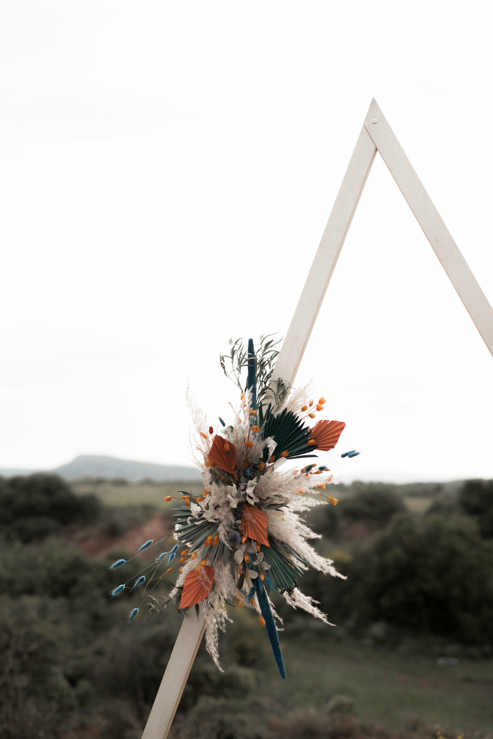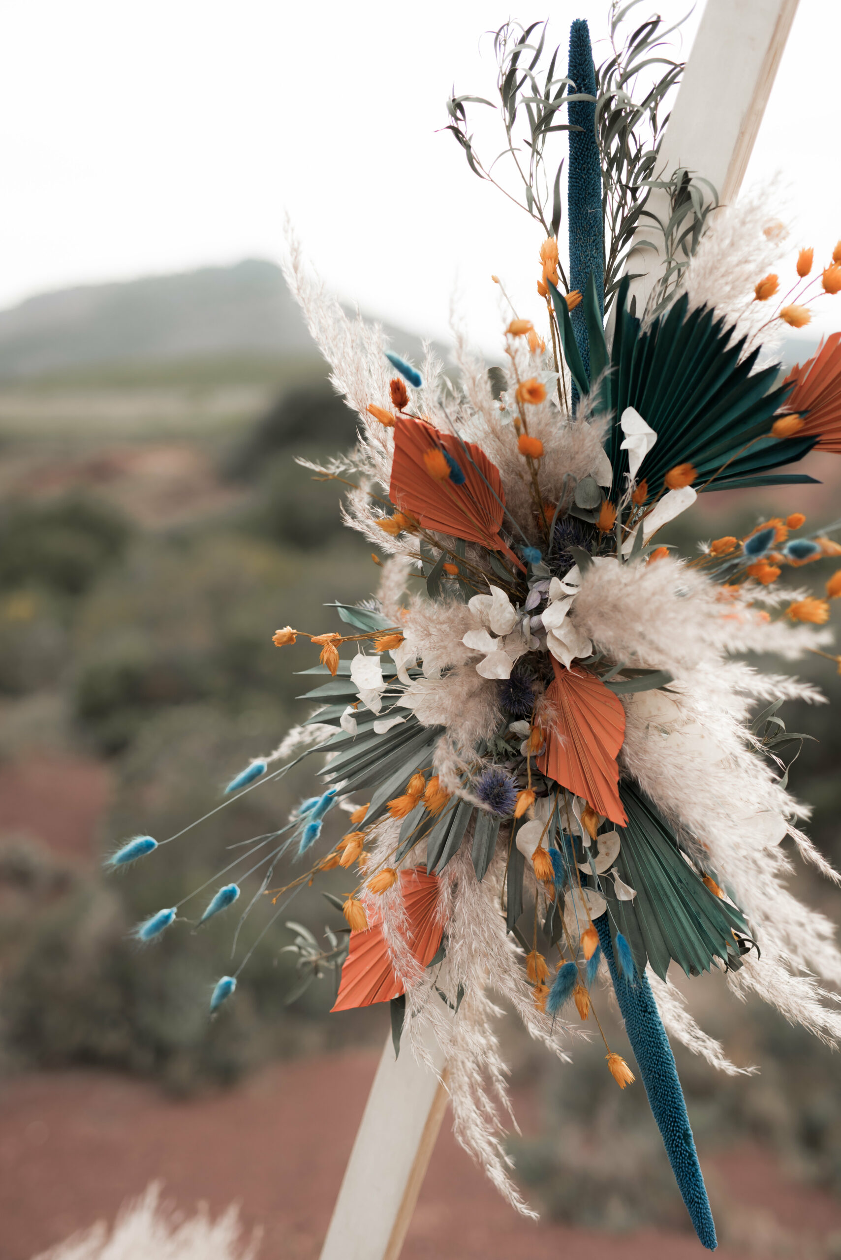 En ce qui concerne la cérémonie laïque nous avons choisi de rester dans le thème berbère, du bleu canard et de l’ocre. Sous les conseils de la décoratrice, nous avons opter pour une arche en triangle afin de rappeler aussi l’environnement.