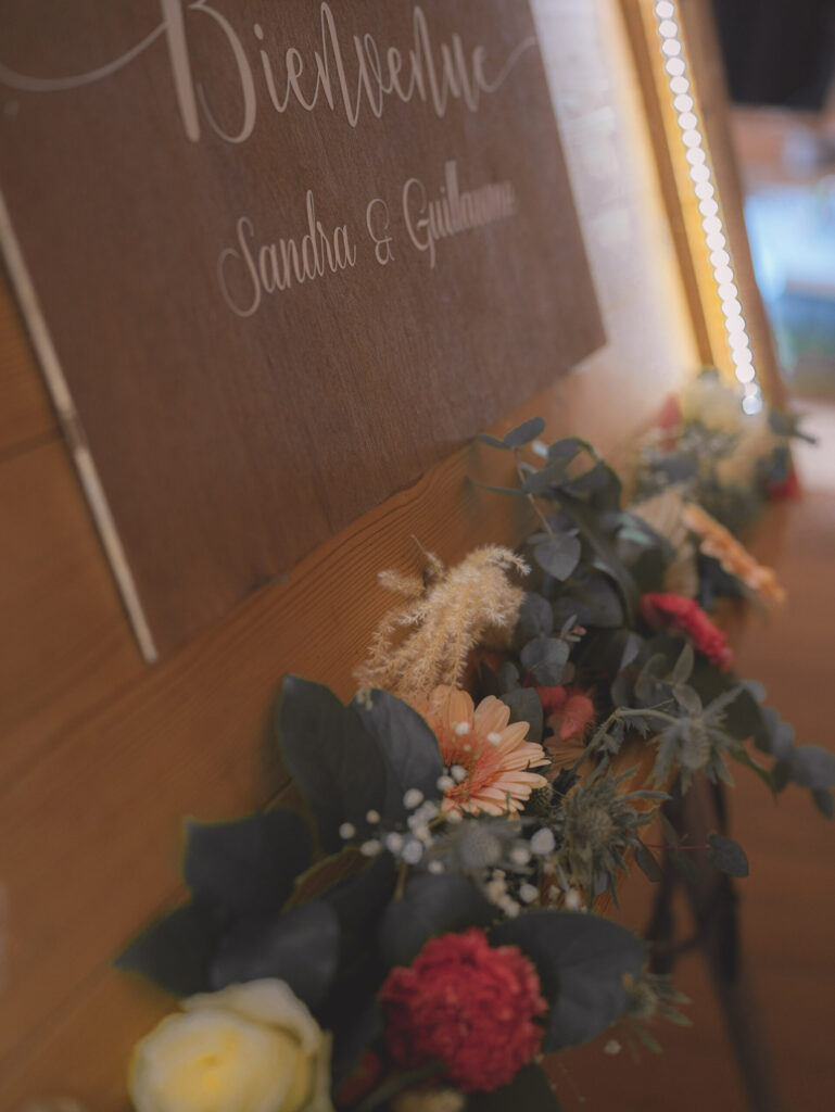 Ces couleurs permettent de mettre en avant la couleur bois et de souligner la beauté de la papeterie. Le vert finis par être le feuillage. Les mariés ont mis leur panneau de bienvenue avait une guirlande en bas du cadre qui est souligner par la lumière présente aussi.