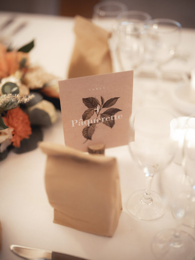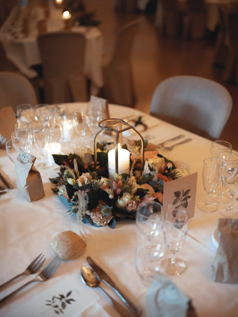 La simplicité est passé par une belle couronne de fleurs et une lanterne au centre. Cette couronne met en avant le dorée du cadre mais aussi la bougie au centre. Cette chaleur permet de souligner les couleurs naturelles présent dans la salle mais aussi de la vaisselle!